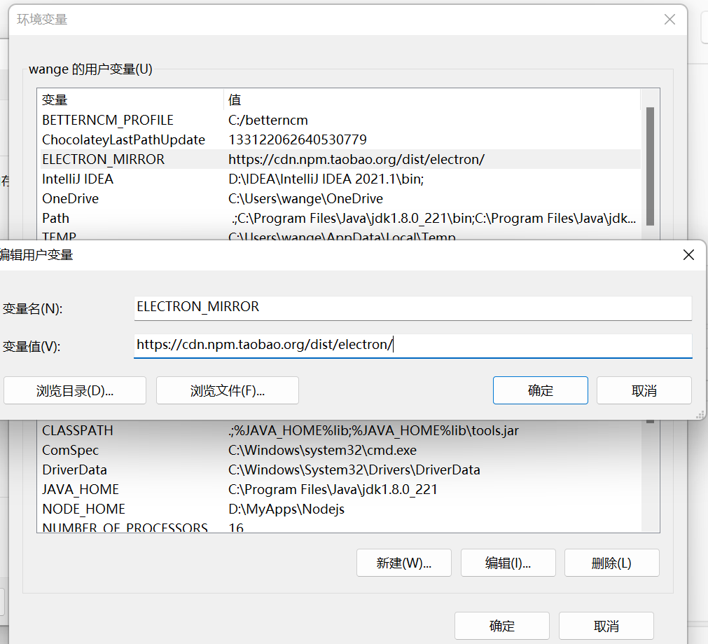 ​ 由于国内网络环境原因可能需要多安装几次才可以成功,或者可以切换一下镜像源改成国内的,在系统变量中添加一条用户变量,如图所示: